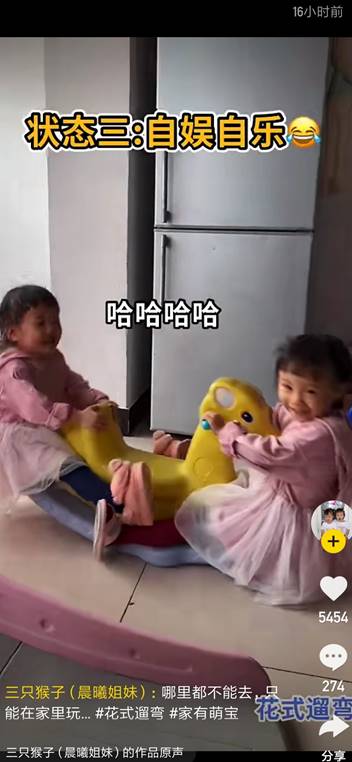 “三只猴子(晨曦姐妹)”(ID:Nadya0909)的記錄視頻顯示,雙胞胎姐妹兩人在家無聊,拿著打氣筒給耳朵打氣,給嘴巴打氣,吃遍家里所有零食,自娛自樂玩蹺蹺板,睡覺。有同是寶媽的老鐵用戶評論,自家龍鳳胎也是有一個多星期沒下過樓。另一位寶媽附和,自家雙胞胎四五天沒下床。一老鐵評論,等疫情過去以后誰也不要嘲笑誰胖,好嗎?