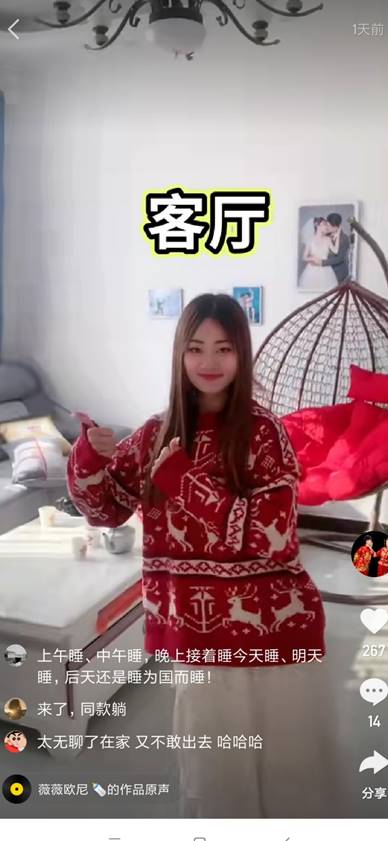 “在家一日游”引起老鐵爭相模仿,用戶“婷婷呀”( ID:154714742)錄制同款視頻顯示,在家客廳游、浴室游、廚房游、樓梯游、陽臺游。一同城老鐵留言稱,自己上午睡、中午睡,晚上接著睡,今天睡、明天睡,后天還是睡,為國而睡。