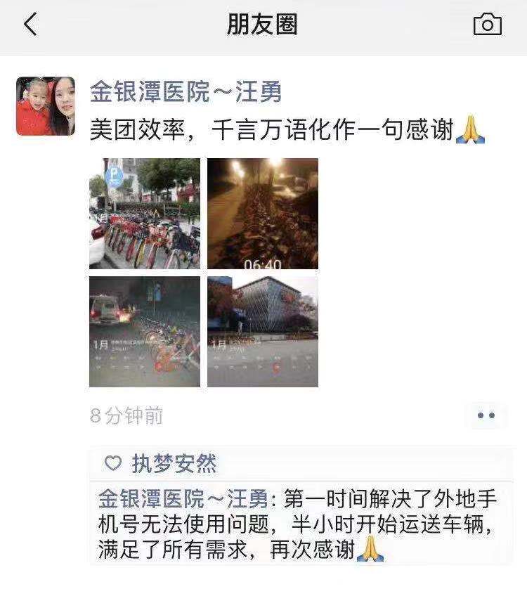 1月29日,汪女士在微信朋友圈“隔空喊話”,希望共享單車企業能緊急支援,在相關區域加大投放,以解決醫護人員通勤問題。美團單車運營團隊了解到這個信息后,在半小時內緊急調配300輛單車馳援前線,保障了金銀潭醫護、防疫人員免費出行。