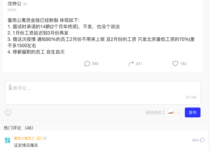 有觀點甚至認為,蛋殼公寓面試時承諾的14薪沒有發放、延遲工資發放、并借疫情通知員工不用上班僅發放北京最低工資的70%約1500元左右,種種跡象實為蛋殼公寓資金鏈斷裂的表現。