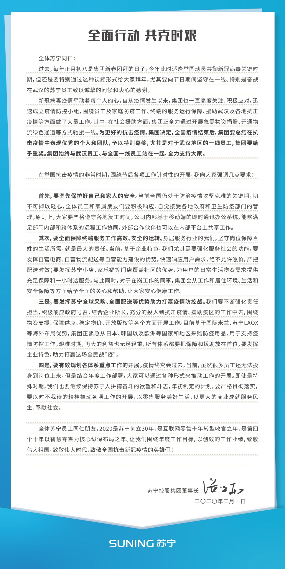 張近東同時提醒全體員工及家屬,要積極響應、自覺接受各地政府和衛生防疫部門的管理。