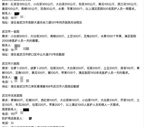 1月31日,武漢同濟醫院光谷分院的工作人員向拼多多發來了一份求助清單:350公斤紅菜苔,500公斤白菜,100公斤黃瓜,100公斤番茄,50公斤豆角,西蘭花100公斤,蘋果3500個……該工作人員表示,如果這些蔬果全部供應,也僅夠醫院500名醫護人員吃一周。除同濟醫院光谷分院外,武漢市第一醫院、第六醫院、優撫醫院也第一時間向拼多多發出了類似求助信息。