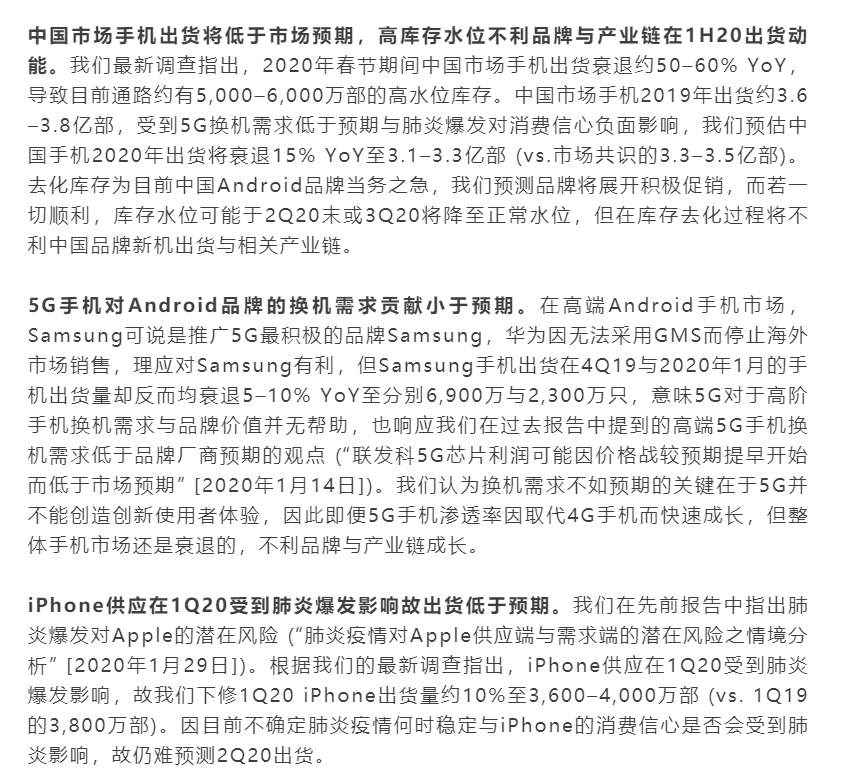 速途網訊 昨日,天風國際旗下分析師郭明錤發布最新報告稱,2020年第一季度手機行業存在不小的挑戰,比如蘋果已經將本季度的iPhone出貨量下調了10%(至少是百萬部)。報告指出,2020年第一季度的手機行業,手機品牌與產業鏈正面臨3個潛在風險:1.中國市場手機出貨將低于市場預期;2.5G手機對Android品牌換機需求貢獻小于預期;3.iPhone供應在1Q20受到疫情爆發影響故出貨低于預期。
