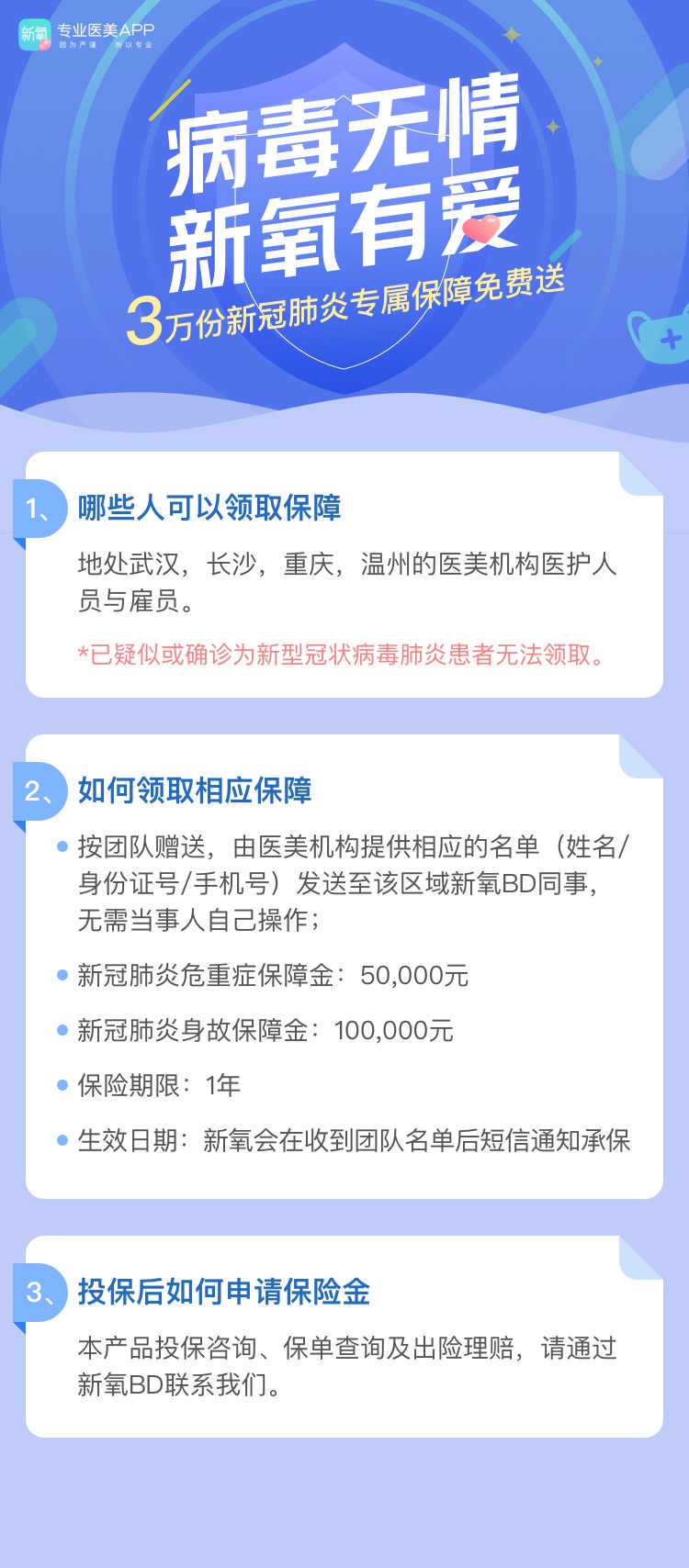 新氧的保險團隊將為武漢,長沙,重慶,溫州四座城市醫美機構的所有醫護人員贈送新型冠狀病毒引發肺炎的專項保險,提供最高15萬元的保障金,總計3萬份。(承保細節另行詳細說明)