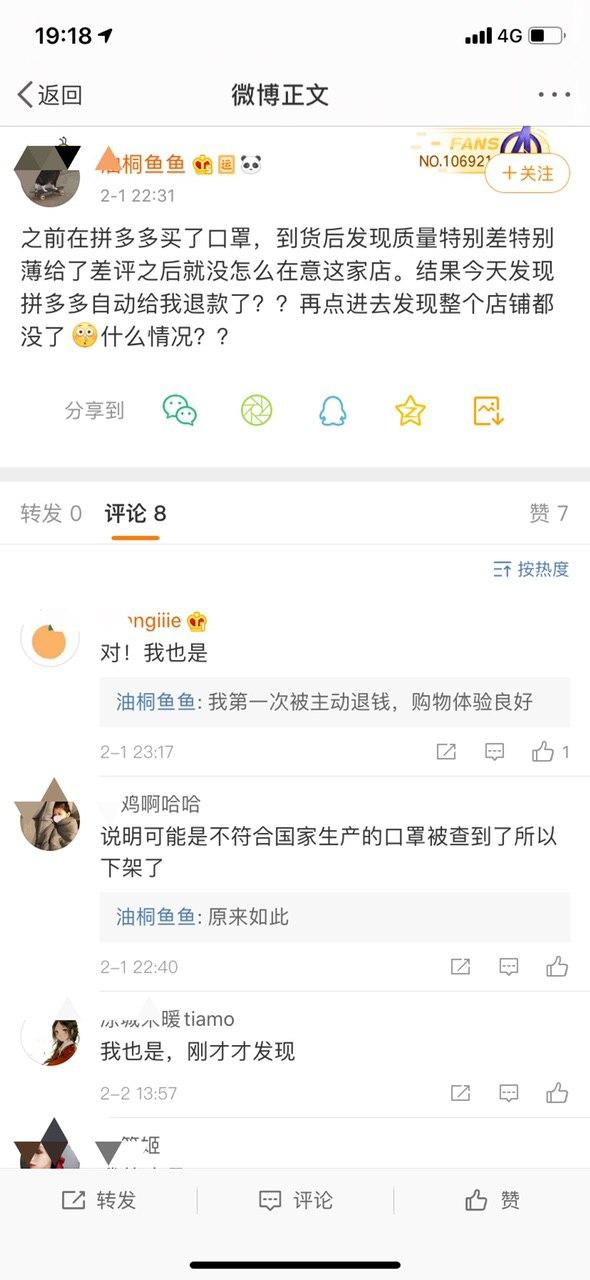 拼多多“抗疫工作組”組長傅正表示,在口罩供需失衡的情況下,為避免消費者利益受損,平臺已針對疫情相關醫療衛生商品啟動特殊預案。在店鋪的全部已售商品中,一旦發現貨不對版、嚴重質量瑕疵等問題,拼多多將對該店鋪同批次商品的全部訂單進行自動全額退款,不需要消費者發起任何申請。