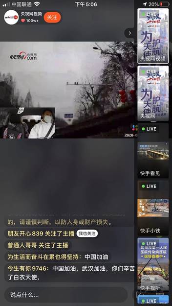 這樣真實的對話場景讓網友們異常感動。在直播間里,網友們都在喊“武漢加油”“中國加油”。央視網視頻中心負責人說,“快手老鐵們也非常給力,在直播過程中一直給我們的志愿者司機和醫護人員鼓勵加油,這是最真實、最樸素、最動人的情緒。我們常說,用戶在哪里,我們的宣傳工作就要做到哪里,我想,這就是最好的印證。”