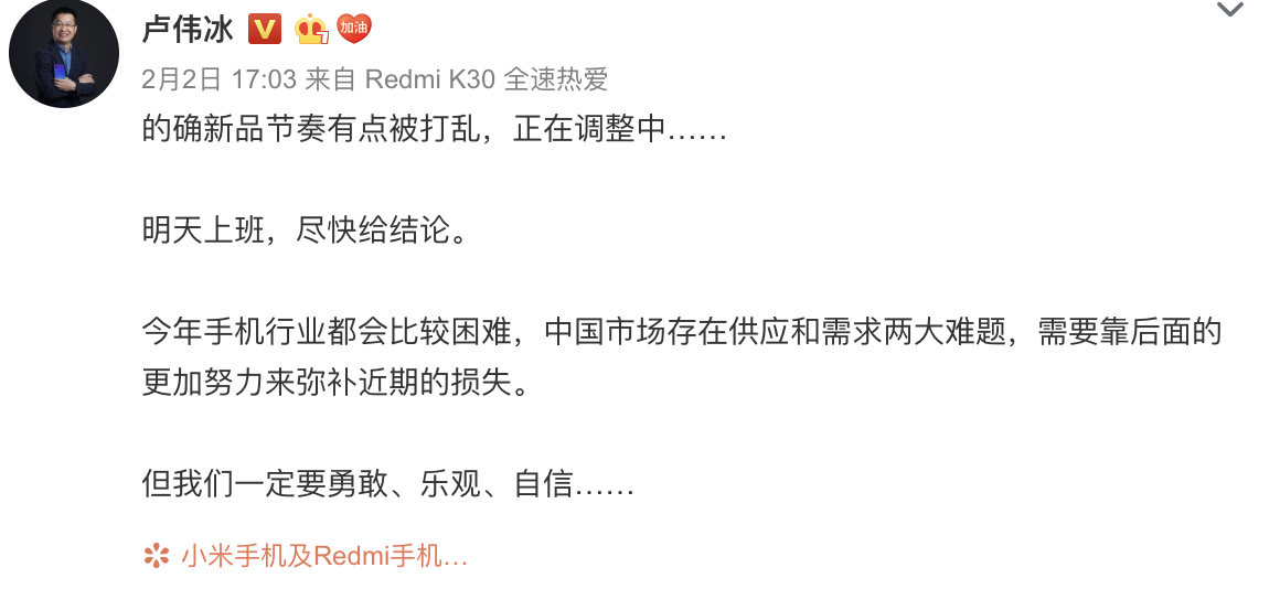 對此,小米集團副總裁、Redmi品牌負責人盧偉冰曾在微博中表示“今年手機行業都會比較困難,中國市場存在供應和需求兩大難題,需要靠后面的更加努力來彌補近期的損失?!?/em>