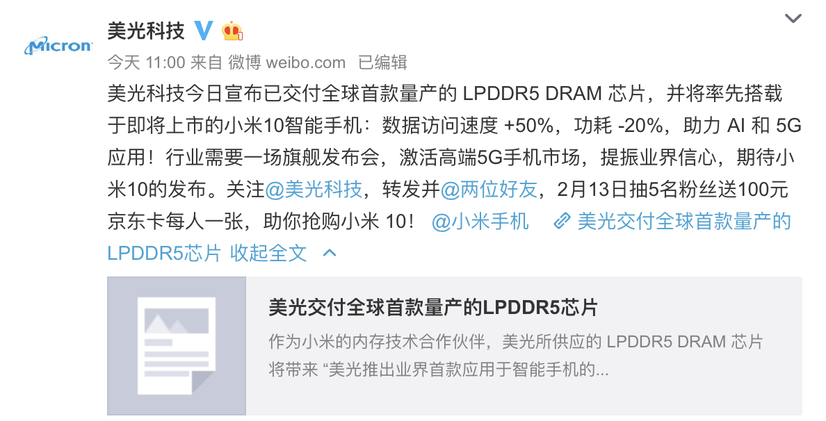 同時美光科技還在微博中表示,LPDDR5內存將率先搭載于即將上市的小米10智能手機中。同時,小米集團創始人雷軍也在微博中確認了此消息,并劇透稱“小米10全線采用LPDDR5”。