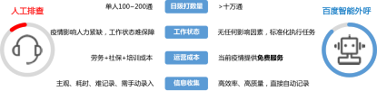 百度承諾,從2020年1月28日開始到疫情結(jié)束,向各級(jí)政府、衛(wèi)健委機(jī)構(gòu)、基層社區(qū)、疾控中心等相關(guān)疫情防控機(jī)構(gòu)開放智能外呼平臺(tái),不收取任何費(fèi)用。