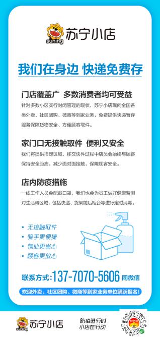 蘇寧向外賣、社區團購等到家業務推出免費快遞暫存服務 仙雯 ? 2020年2月10日 09:32 ? 快訊, 零售 速途網訊 昨日晚間,蘇寧易購宣布,即日起旗下蘇寧小店、蘇寧易購社區店等遍布全國各地,離消費最近的門店將免費向各類外賣、社區團購、微商等到家業務開放快遞暫存服務,并嚴格執行“無接觸配送”,消費者可到線下數門店等“無接觸取件”,以此減少人員接觸,保護消費者、騎手和快遞員的安全和健康。 蘇寧小店蘇寧易購 贊 (0) 仙雯 0 生成海報 拼多多上線新商品評價系統“評小圈”,嚴打“虛假好評” 上一篇 2020年2月10日 09:29 滴滴出行:疫情高發區返程司機須隔離期滿無異常后再接單 下一篇 2020年2月10日 09:34