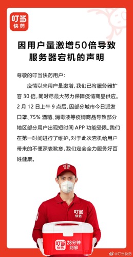 速途網2月12日消息(報道:吳佳馨)今日,叮當快藥官方微博發布因用戶量激增50倍導致服務器宕機的聲明。