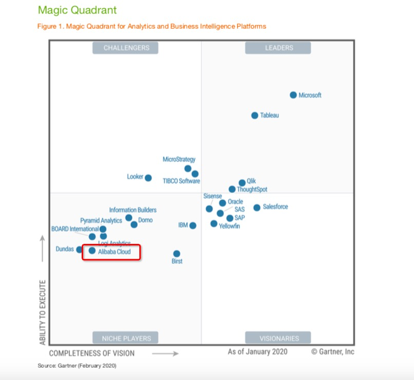 2月12日,國際知名調研機構Gartner發布了2020年商業智能和分析平臺魔力象限報告,阿里云成為首個且唯一入選該領域魔力象限權威評測的中國企業。
