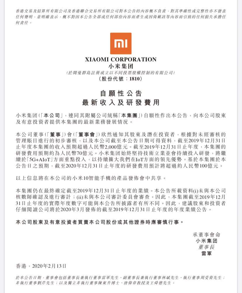 速途網(wǎng)訊 今日,小米集團(tuán)發(fā)布自愿性公告,公布2019年收入及研發(fā)費(fèi)用等三項(xiàng)預(yù)期數(shù)字。公告顯示,2019年小米全年總收入預(yù)期超2000億元人民幣,研發(fā)費(fèi)用預(yù)期約70億元人民幣。同時(shí),還預(yù)期2020年全年研發(fā)投入超100億元人民幣。小米集團(tuán)表示,會(huì)始終堅(jiān)持技術(shù)立業(yè)并會(huì)持續(xù)投入研發(fā),將繼續(xù)在“5G+AIoT”方面重點(diǎn)投入,以持續(xù)擴(kuò)大在智能生活方面的領(lǐng)先優(yōu)勢(shì)。