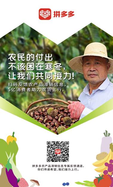 拼多多表示,歡迎受到滯銷影響的農(nóng)人和農(nóng)業(yè)合作社主動(dòng)提供信息,也歡迎其他政府部門、公益組織、媒體機(jī)構(gòu)及行業(yè)協(xié)會(huì)等與拼多多建立合作,共同收集和反饋相關(guān)信息,協(xié)助滯銷農(nóng)戶(入口鏈接:7pd.cn/aYYmrOpk或從下方海報(bào)掃碼進(jìn)入)。