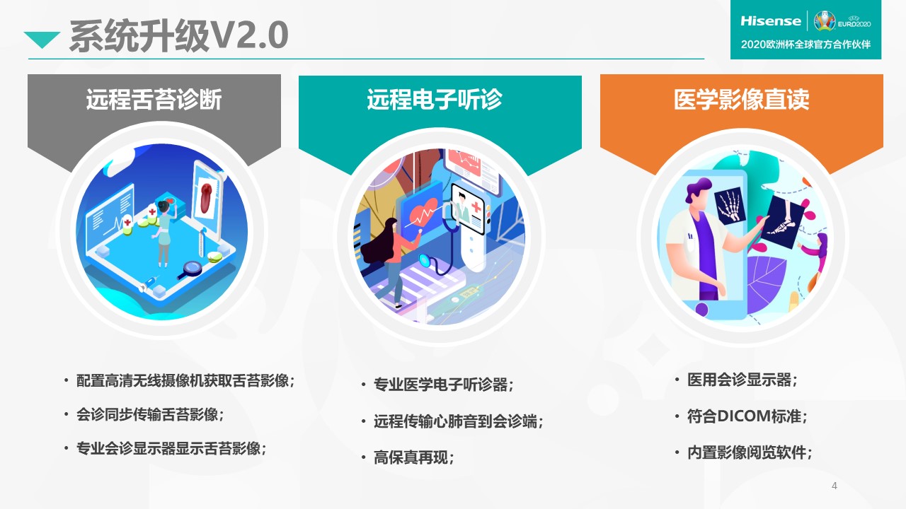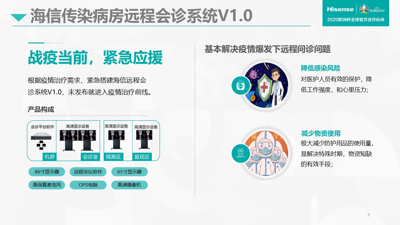 在抗擊疫情過程中,海信在1月23日(臘月二十九)早上,收治山東首例新冠肺炎患者的青島大學(xué)附屬醫(yī)院向我們發(fā)出了救援信息,希望能夠緊急搭建一套隔離病房的視頻會診系統(tǒng),他們下午3點要組織專家對患者進(jìn)行會診。收到需求后,我們迅速組成海信醫(yī)療設(shè)備公司與青大附院協(xié)同小組。在5個小時之內(nèi)緊急搭建完成了遠(yuǎn)程會診系統(tǒng)。這套系統(tǒng)可以對接病房,又可以對接遠(yuǎn)程會診中心和專家辦公室,同時可與上下級醫(yī)院隨時溝通,專家不用進(jìn)入病房就可以清楚地看見病人的舌苔,檢查病人的病情和各項特征,并可以隨時召集各方專家進(jìn)行會。