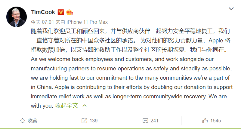 速途網訊 今日早間,蘋果CEO庫克發布微博稱,“隨著我們歡迎員工和顧客回來,并與供應商伙伴一起努力安全平穩地復工,我們一直恪守著對所在的中國眾多社區的承諾。 為對他們的努力貢獻力量,Apple將捐款數額加倍,以支持即時救助工作以及整個社區的長期恢復。我們與你同在?!?/p>