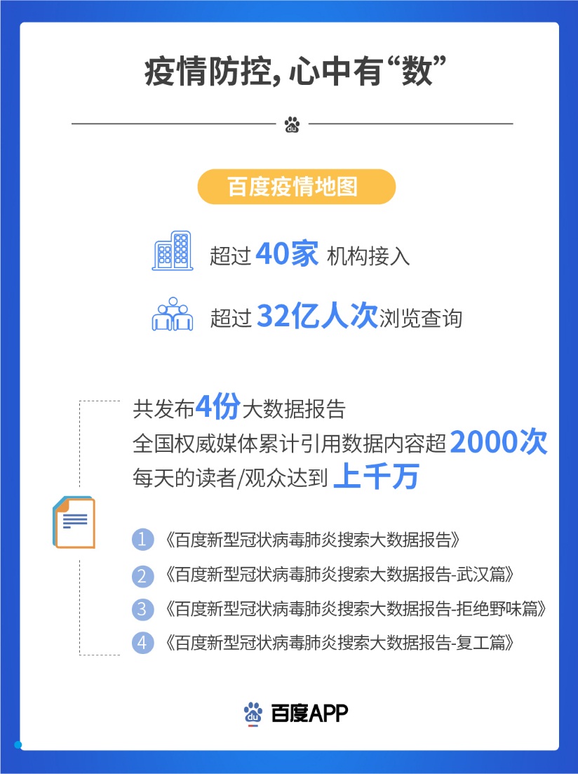 特殊時刻,大數(shù)據(jù)也成了網(wǎng)民做好自身防護的有力工具。在疫情地圖版塊,已有超過32億人次瀏覽查詢疫情動態(tài)。百度發(fā)布的4份新冠病毒搜索大數(shù)據(jù)報告也已被全國權威媒體累計引用超2千次,每天的讀者、觀眾達上千萬。