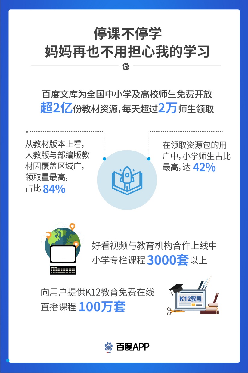 面對停課不停學的需求,百度文庫為全國中小學及高校師生免費開放了超2億份教材資源,每天超過2萬師生領取。