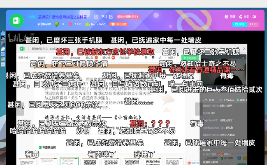而屏幕另一端的同學們更是刷出了滿屏的知識點,被稱為B站史上“最硬核”的彈幕。當化學老師講到美拉德反應時,五湖四海的氨基酸火速集合。當數學老師教大家回歸方程預測自己孩子的身高,年近18的學生變身老父(母)親,計算孩子身高。當語文老師教大家用“甚閑”造句,滿屏都是甚閑在家同學們的日常……