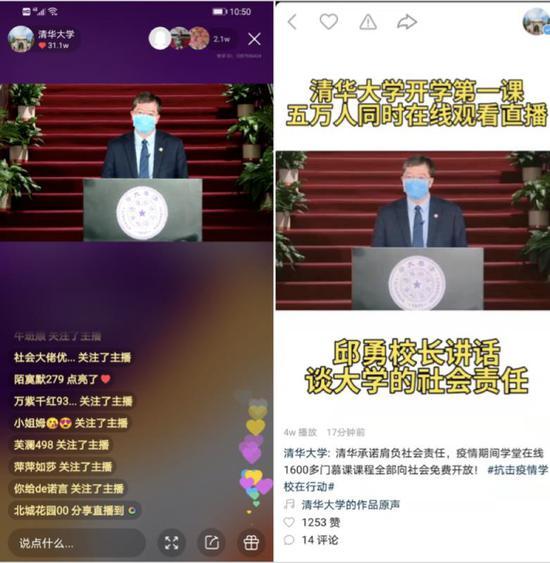 與清華大學宣傳部合作,推出“宅家充電”、“宅家”云學堂等系列直播,目前已直播38場,總觀看量超3100萬,總點贊489萬,邀請校內外名師大家,課程覆蓋國際關系、創新創業、公眾表達、心理健康、傳統文化、藝術賞析等多個方面。
