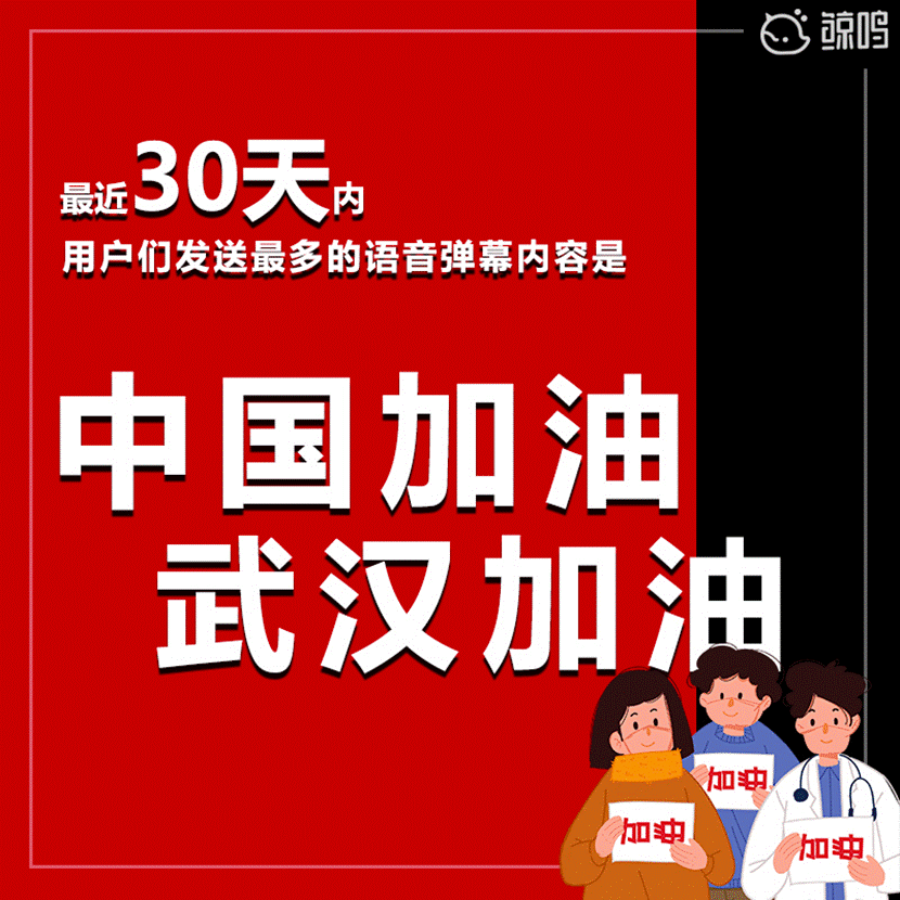 在抗擊疫情的當下,鯨鳴用戶正在通過語音彈幕的方式,為奮戰在一線的醫護人員加油打氣。在鯨鳴發起的“愛與希望”創作活動中,共有全國20多萬用戶參與,發布作品4000多首,為武漢加油打氣的語音彈幕評論達32萬條。報告顯示,近30天用戶發布最多的語音彈幕是“中國加油、武漢加油”,語音彈幕不僅是95后的交流方式更顯示出了他們的態度和責任。