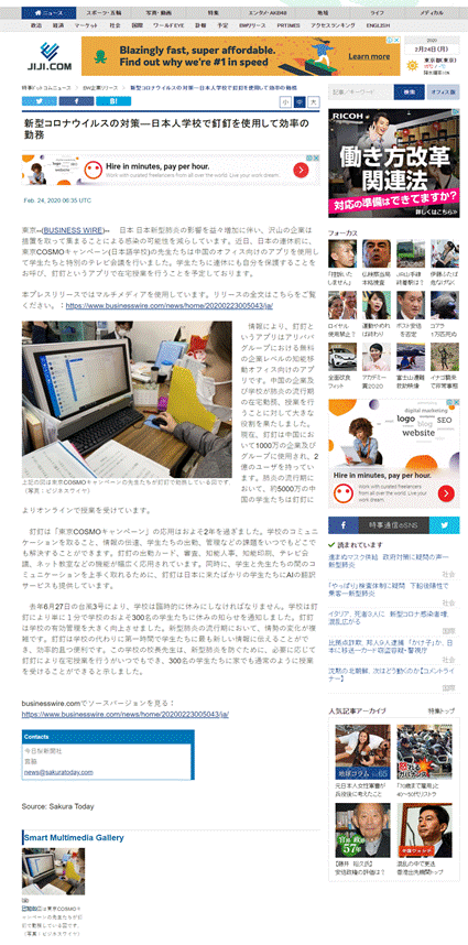 速途網(wǎng)訊 近日,據(jù)日本媒體JIJI.COM報道,在日本小長假來臨之前,日本語學(xué)校東京COSMO學(xué)園老師采用中國辦公軟件釘釘,與在校學(xué)生舉行了一場特別的視頻會議,提醒學(xué)生們在休假期間也要注意自我保護(hù),并計劃通過釘釘開啟遠(yuǎn)程上課。