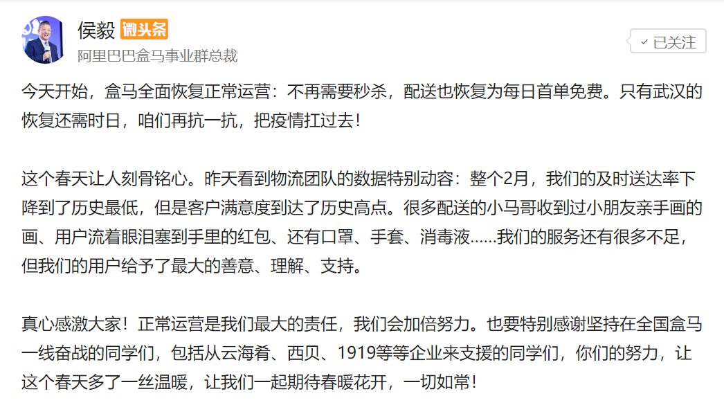 盒馬總裁侯毅在其社交平臺賬號上表示,盒馬全面恢復正常運營了,用戶也可以告別秒殺了,“疫情期間,正常運營是我們最大的責任,我們會加倍努力。武漢的恢復還需要一些時間,大家一起再抗一抗,把疫情扛過去。”