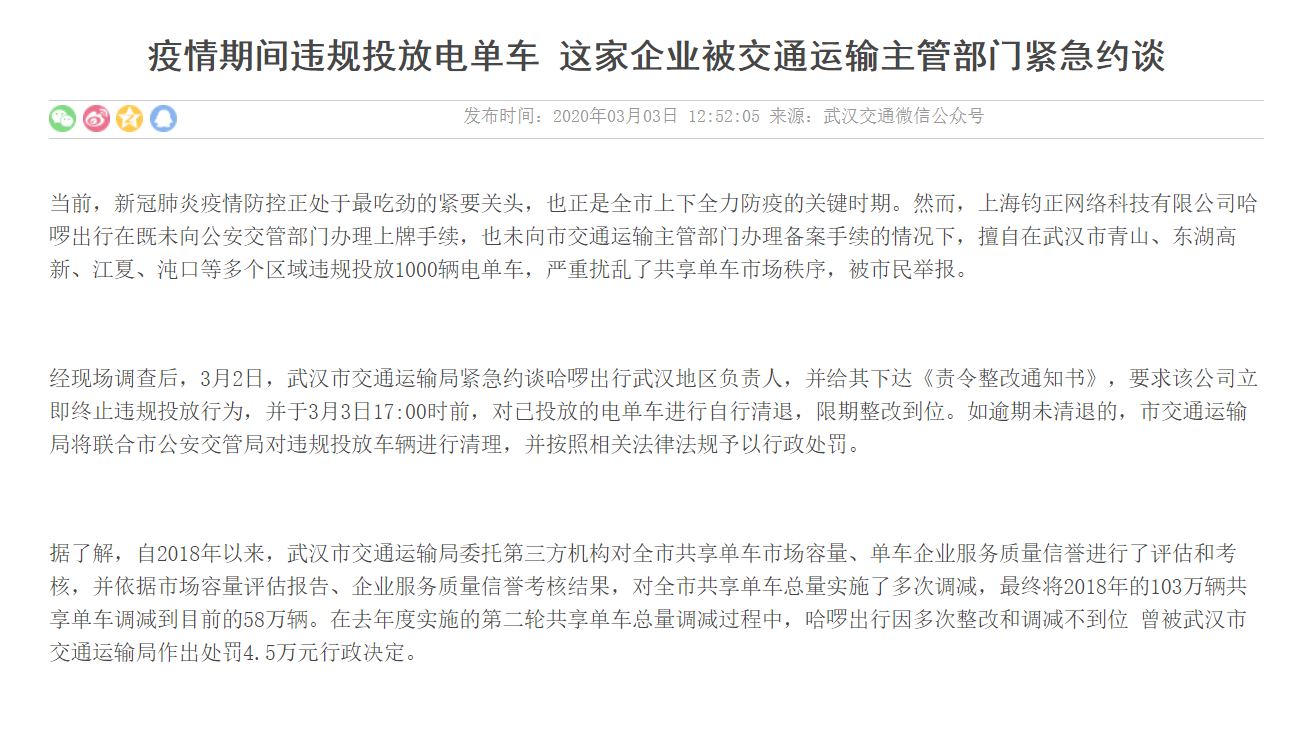 速途網訊 今日,據武漢市交通運輸局消息,上海鈞正網絡科技有限公司哈啰出行在既未向公安交管部門辦理上牌手續,也未向市交通運輸主管部門辦理備案手續的情況下,擅自在武漢市青山、東湖高新等多個區域違規投放1000輛電單車。3月2日,武漢市交通運輸局緊急約談哈啰出行武漢地區負責人,并給其下達《責令整改通知書》,要求該公司立即終止違規投放行為,并于3月3日17:00時前,對已投放的電單車進行自行清退,限期整改到位。