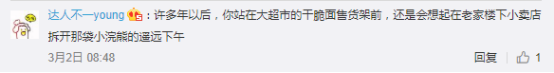 “許多年以后,你站在大超市的干脆面貨架前,還是會想起在老家樓下小賣店拆開那袋小浣熊的遙遠下午”。在官方微博下,有一名用戶這樣寫道。