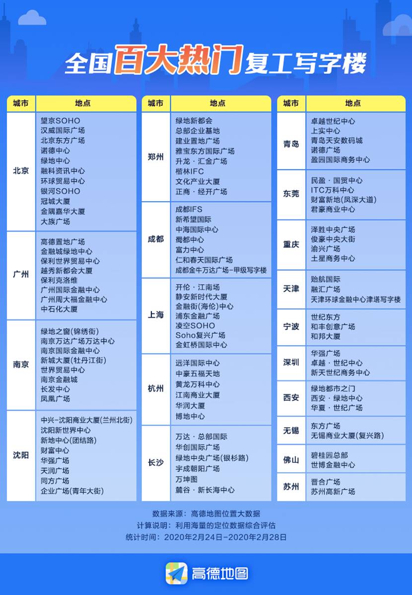 基于海量的位置大數據,高德公布了“全國百大熱門復工寫字樓”。榜單顯示,全國19個城市的寫字樓榜上有名,當前熱門復工寫字樓主要集中長三角、珠三角、京津冀、成渝等地區。其中,北京有11座寫字樓入榜,在全國數量最多,廣州、南京、鄭州、沈陽各有8座入榜,上海和成都則各有7座緊隨其后。