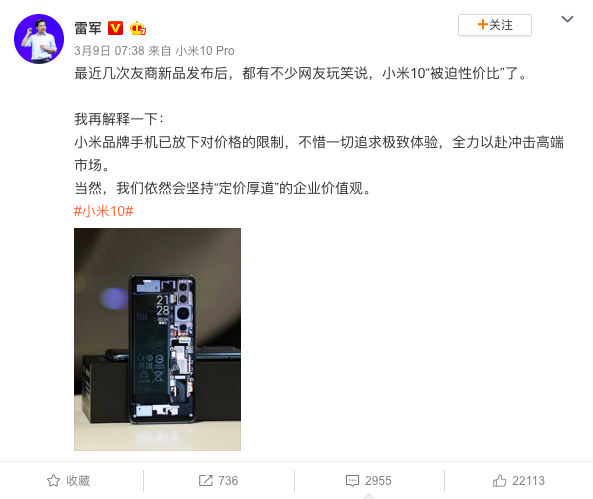 雷軍:小米品牌全面放開價格限制,全力以赴沖擊高端市場 仙雯 ? 2020年3月10日 09:22 ? 快訊, 手機 速途網訊 雷軍在微博回應小米10“被迫性價比”,他表示,“小米品牌手機已放下對價格的限制,不惜一切追求極致體驗,全力以赴沖擊高端市場。” 小米雷軍 贊 (0) 仙雯 0 生成海報 大V聯動醫院,熱血共抗“疫” 上一篇 2020年3月9日 20:00 CES Asia 2020宣布延期,已簽訂合同的參展商全額退款 下一篇 2020年3月10日 09:23