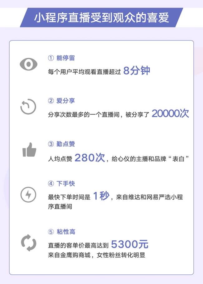 觀眾不僅熱衷于分享、點贊,下手買單也是毫不猶豫。在維達和網易嚴選小程序直播間,最快下單時間僅為1秒。此外,在金鷹購商城的直播間,客單價最高達到了5300元,女性粉絲轉化明顯。