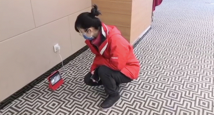 圖:北京援鄂醫療隊在團體心理干預前調試阿里捐贈的AI助手產品