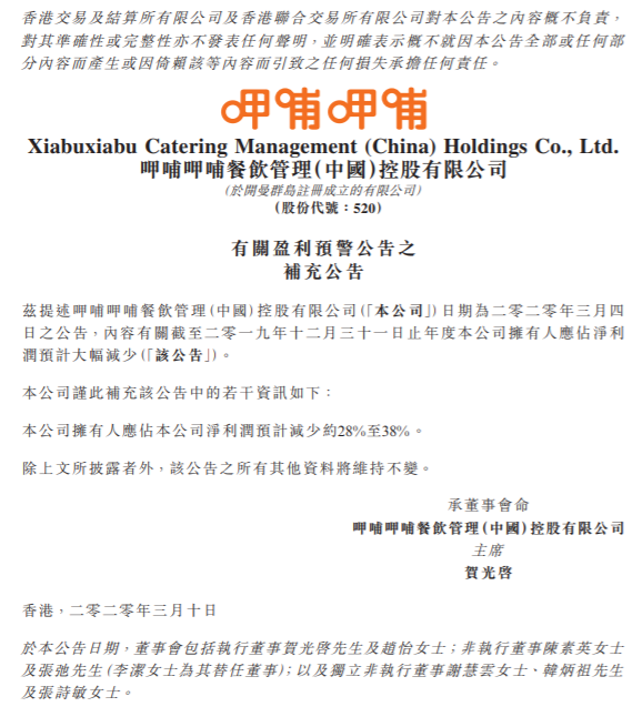 速途網(wǎng)訊 昨日,呷哺呷哺發(fā)布盈利預(yù)警的補充公告,預(yù)計2019年公司凈利潤減少28%-38%。此前,呷哺呷哺曾發(fā)布盈利預(yù)警公告,預(yù)期2019年公司凈利潤較2018年有顯著減少,原因是與租賃相關(guān)的會計準則發(fā)生了變化。