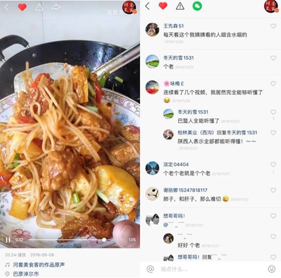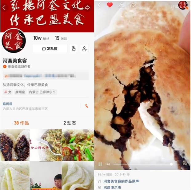 在方言與美食的魅力下,這個(gè)“河套美食客”(快手ID:1151691558)的快手作品里,數(shù)十萬播放量成為標(biāo)配,僅38個(gè)作品就已吸粉十萬。