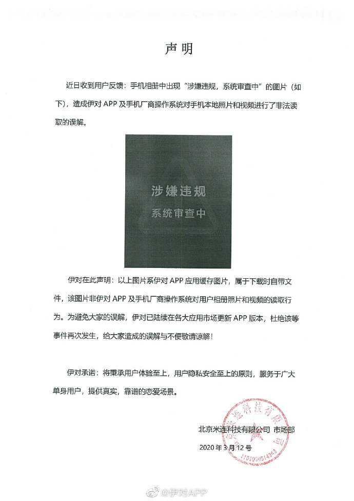速途網訊 今日,伊對APP回應“違規圖片”事件。伊對App表示,該圖片系伊對APP應用緩存圖片,屬于下載時自帶文件,該圖片非伊對APP及手機廠商操作系統對用戶相冊照片和視頻的讀取行為。同時,伊對App稱,為避免大家的誤解,伊對已陸續在各大應用市場更新APP版本。