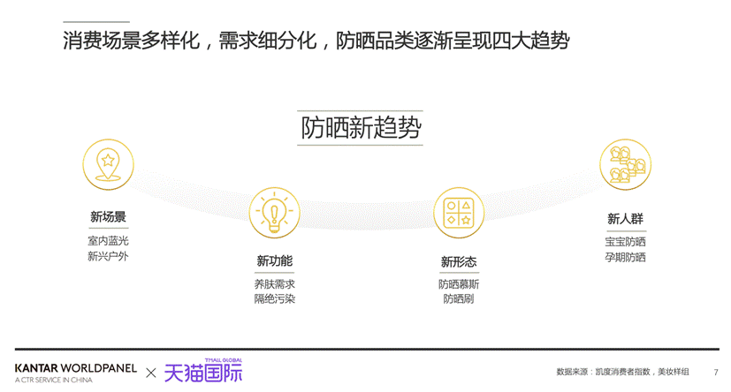 報告稱,新場景下的室內(nèi)藍光、專業(yè)戶外;養(yǎng)膚需求、隔絕污染的新功能;防曬慕斯、防曬刷等新形態(tài);寶寶和孕期的新防曬人群,成為未來1年防曬品類拓展的新市場。