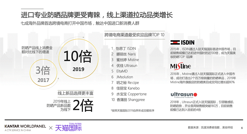 泰國彩妝品牌Mistine成功打造出2個百萬級銷量的防曬單品,2019店鋪防曬類目成交同比增長超80%。引領(lǐng)敏感肌防曬的瑞士品牌Ultrasun,2018年5月入駐天貓國際,開業(yè)首周銷售額突破180萬,并以年同比200%高速增長。