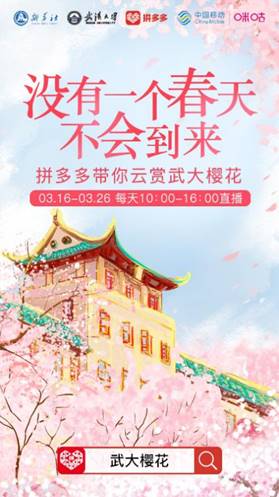 據悉,這次賞櫻直播是拼多多和武漢大學官方展開的合作。拼多多抗疫相關負責人表示,沒有一場疫情不會過去,也沒有一個春天不會到來。