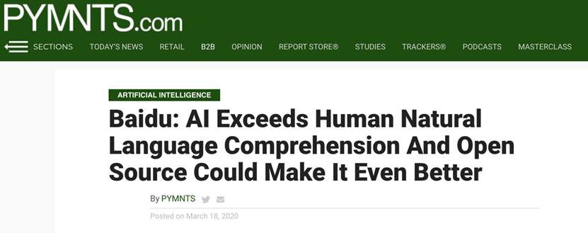 金融科技媒體PYMNTS也關(guān)注到百度AI的實(shí)力。在題為《百度AI超越人類(lèi)自然語(yǔ)言理解能力,并通過(guò)智能云開(kāi)源開(kāi)放AI技術(shù)》的文章中,PYMNTS介紹了百度在NLP等AI 領(lǐng)域近年來(lái)取得的重大技術(shù)突破,比如預(yù)訓(xùn)練模型界“MVP”之稱的百度ERNIE模型。ERNIE于2019年底在自然語(yǔ)言處理領(lǐng)域權(quán)威數(shù)據(jù)集GLUE中榮登榜首,并以9個(gè)任務(wù)平均得分首次突破90大關(guān),刷新該榜單歷史。PYMNTS還特別指出,新冠肺炎疫情中,百度的AI能力大顯身手,尤其是多模態(tài)深度語(yǔ)義理解能力,為需求在線醫(yī)療服務(wù)的普通大眾和居家遠(yuǎn)程工作的人們提供了諸多便利。