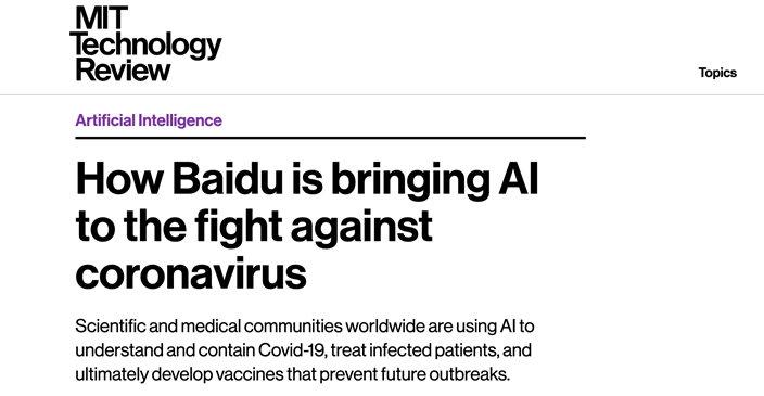 中國(guó)AI近期頻獲外媒關(guān)注。近日,麻省理工科技評(píng)論、Gigabit Magazine、PYMNTS在內(nèi)的國(guó)外科技、金融類(lèi)媒體紛紛刊文,介紹百度AI最新成果,尤其是在近期疫情防中的AI戰(zhàn)疫經(jīng)驗(yàn)。外媒認(rèn)為,中國(guó)AI不容忽視,而中國(guó)AI企業(yè)百度被稱為“全球AI領(lǐng)導(dǎo)者”。