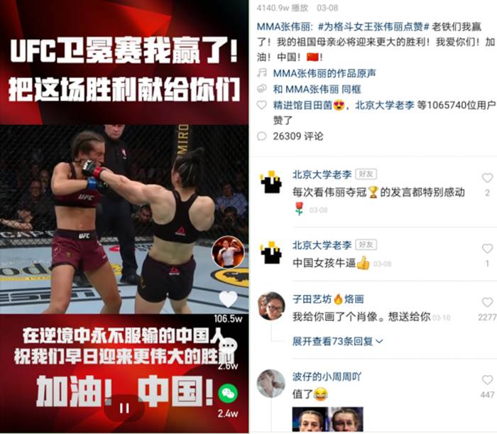 北京時(shí)間3月8日,在美國拉斯維加斯UFC草量級(jí)比賽中,這位來自中國的、“全球最能打的姑娘”戰(zhàn)勝前世界冠軍、波蘭選手喬安娜·耶德爾澤西克喬安娜,成功衛(wèi)冕女子草量級(jí)世界冠軍。面對(duì)屢屢挑釁自己的對(duì)手,場上被打得鼻青臉腫,張偉麗沒有哭泣,身披國旗站在鏡頭前,卻留下熱淚說出上面的話。