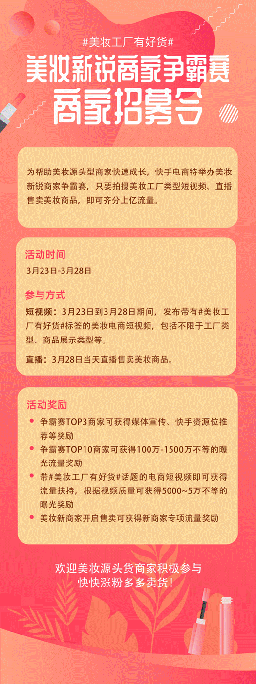 近日,為幫助美妝源頭型商家快速成長,快手電商特地發布了“美妝新銳商家爭霸賽”商家招募令,活動時間為2020年3月23日-28日。3月23日-28日期間,商家可發布帶有#美妝工廠有好貨#標簽的美妝電商短視頻,包括不限于工廠類型,商品展示類型等。同時,商家還可以在3月28日當天直播售賣美妝商品。