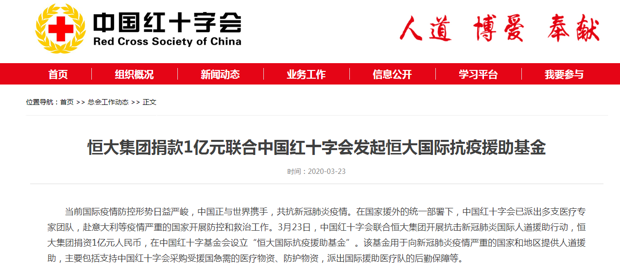 速途網訊 中國紅十字會官網發布消息稱,今日,中國紅十字會聯合恒大集團開展抗擊新冠肺炎國際人道援助行動,恒大集團捐資1億元人民幣,在中國紅十字基金會設立“恒大國際抗疫援助基金”。該基金用于向新冠肺炎疫情嚴重的國家和地區提供人道援助,主要包括支持中國紅十字會采購受援國急需的醫療物資、防護物資,派出國際援助醫療隊的后勤保障等。