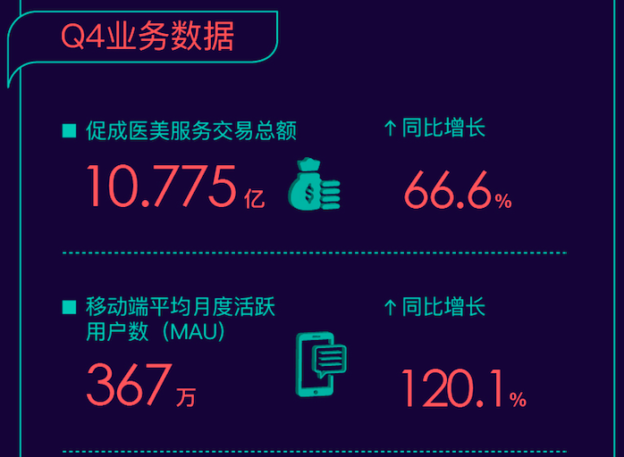 新氧目前是中國用戶規模最大、入駐機構和醫生最多的醫美平臺。伴隨中國醫美行業爆發,新氧業務亦增長強勁。四季報顯示,新氧APP的平均月活躍用戶達到367萬,同比增長120.1%,連續兩季月活增長超過120%;促成醫美服務交易總額10.775億元,同比增長66.6%。全年促成醫美服務交易總額累計達到36.406億元,同比增長72.6%。