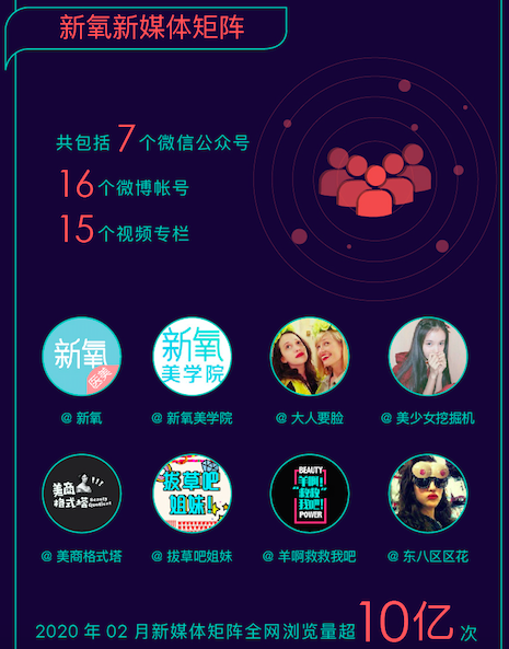 2014年5月,新氧微信公眾號發出第一篇文章。到2020年2月,新氧新媒體矩陣形成包括7個微信公眾號、16個微博帳號、15個視頻專欄構成的MCN矩陣,內容覆蓋醫美、護膚、健身、美妝、審美等領域,全網月瀏覽量超過10億次,相比去年同期增長超過200%。
