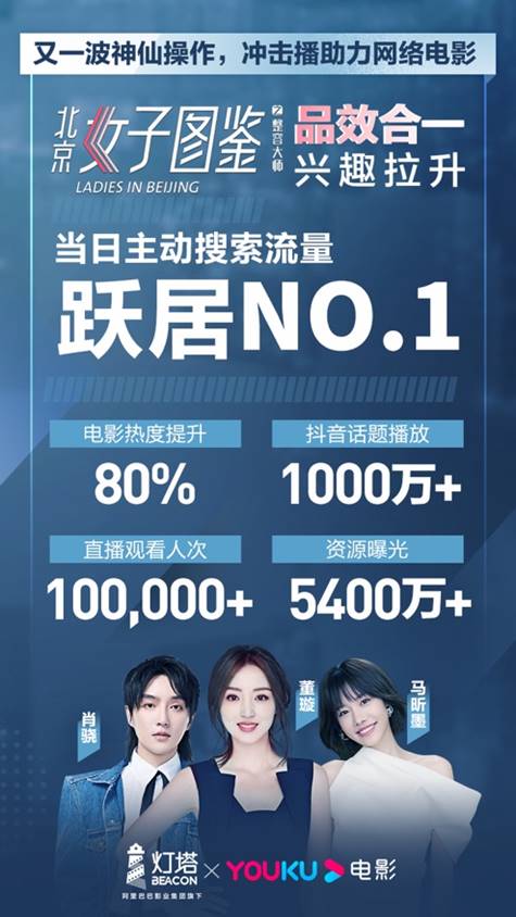3月19日,阿里影業(yè)旗下一站式互聯(lián)網(wǎng)宣發(fā)平臺(tái)燈塔,首次將線上路演產(chǎn)品“沖擊播”用于網(wǎng)絡(luò)電影的宣傳。在優(yōu)酷直播間,肖驍與電影主演董璇、馬昕墨、導(dǎo)演寒松昀進(jìn)行了直播對談,活動(dòng)吸引了超百萬網(wǎng)友關(guān)注,也讓網(wǎng)絡(luò)電影《北京女子圖鑒之整容大師》登頂了優(yōu)酷站內(nèi)主動(dòng)搜索第一位、抖音熱搜第三位。