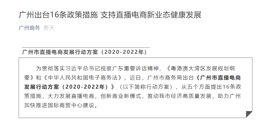 速途網訊 昨日,“廣州商務”微信公眾號發文稱,廣州市商務局印發《廣州市直播電商發展行動方案(2020-2022年)》。其中提到,到2022年,推進實施直播電商催化實體經濟“爆款”工程,即構建一批直播電商產業集聚區、扶持10家具有示范帶動作用的頭部直播機構、培育100家有影響力的MCN機構、孵化1000個網紅品牌(企業名牌、產地品牌、產品品牌、新品等)、培訓10000名帶貨達人(帶貨網紅、“網紅老板娘”等),將廣州打造成為全國著名的直播電商之都。