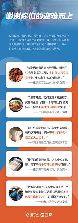 疫情期間,口碑餓了么4次減免傭金,累計為20萬商家減免外賣傭金3%-5%,同時為1萬多名商家提供了總額超過10億元的專項資金支持。