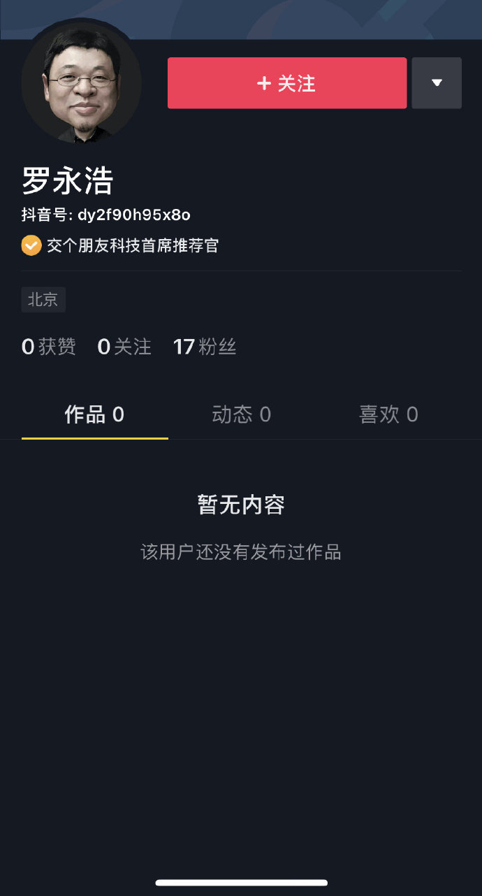 目前,抖音賬號(hào)名為羅永浩,并且認(rèn)證為交個(gè)朋友科技首席推薦官的賬號(hào)已曝光。有人士證實(shí),這個(gè)賬號(hào)正是羅永浩本人賬號(hào)。